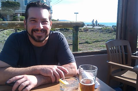 Can't believe how beautiful the weather was at the coast this weekend. Very nice lunch... outside... with the (almost) birthday boy. Behind him you can see the Inn where we were staying, and the ocean.